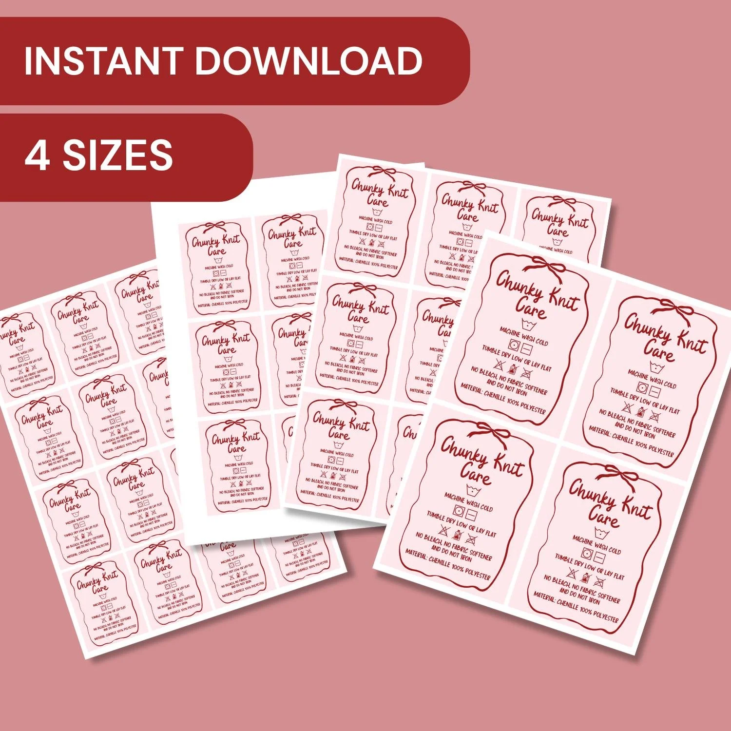 Chunky Knit Blanket Care Card Printable, Wash Instructions Tag Digital Download, Chenille Polyester Tags, PNG and PDF Files PINK