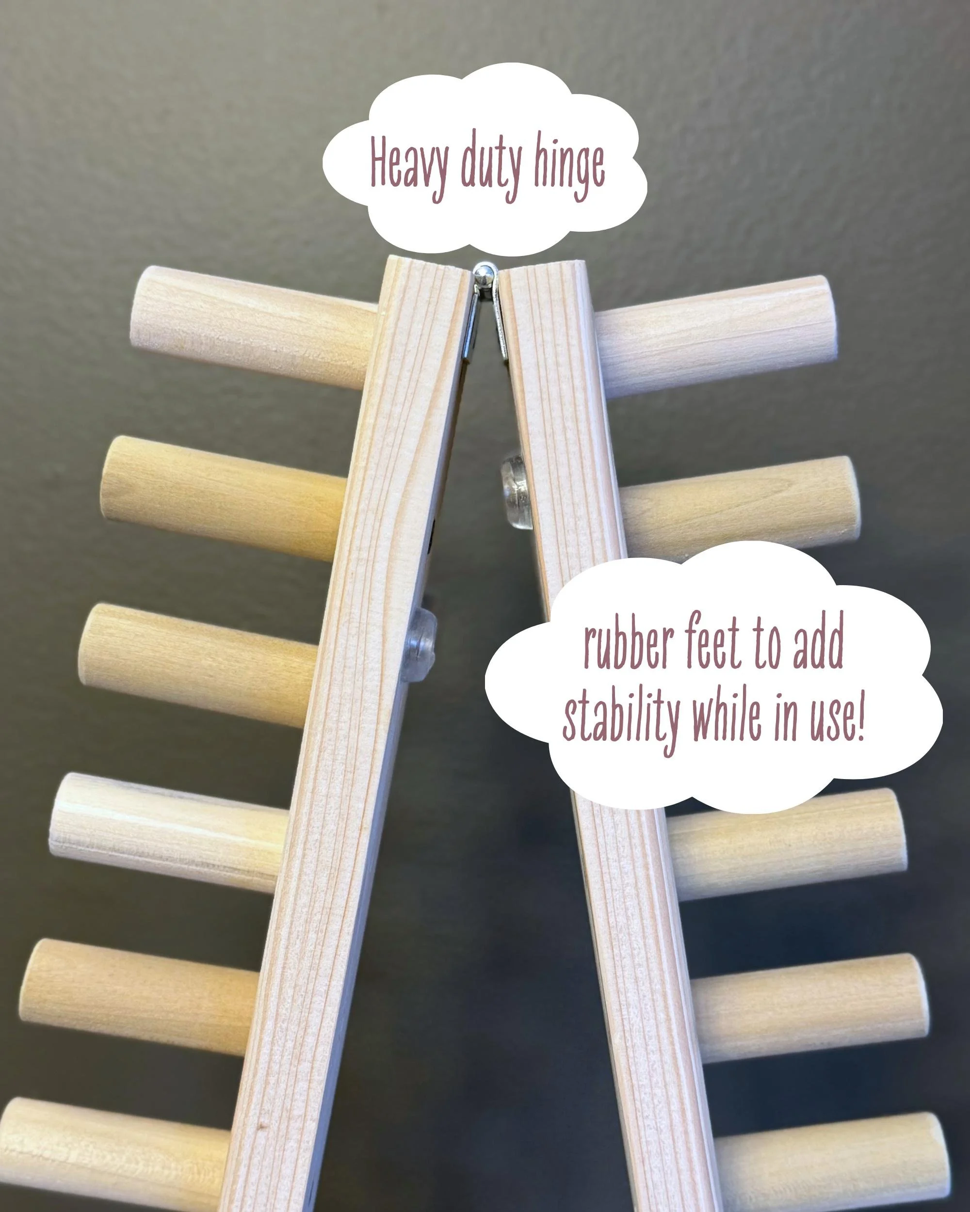Crafted from high-quality solid wood, this loom is built to withstand repeated use while maintaining its shape and durability. The loom is meticulously sanded to prevent yarn from snagging or splintering. Each wooden peg measures 2.5” in length and is securely recessed 1/2” into the base for stability, giving you approximately 2.0" to work with. Plus, each peg is reinforced with a high-quality screw. The loom base features rubber feet to ensure it remains steady during use. (feet may be clear or black)