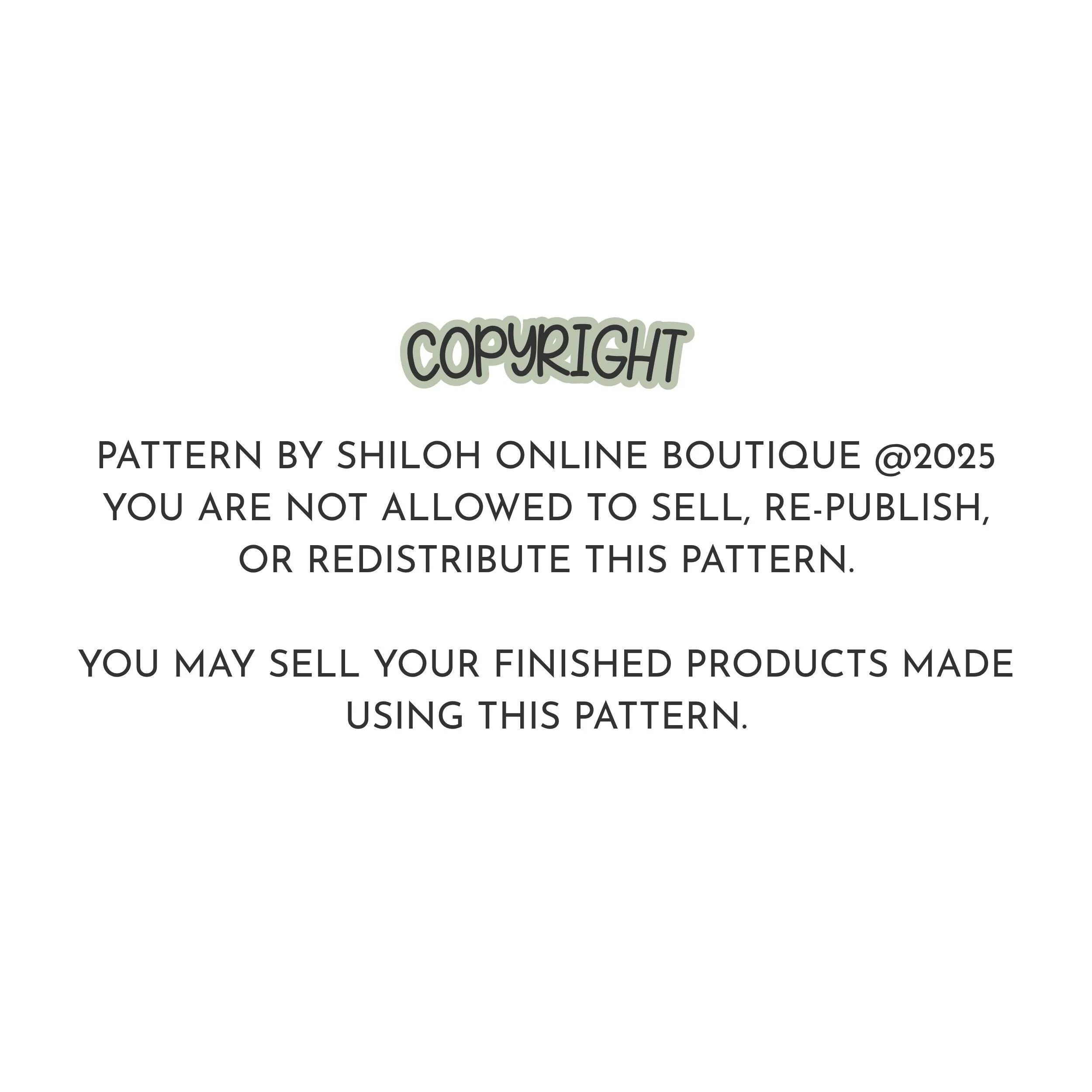 PLEASE NOTE: This is a pattern and not a physical item. Nothing will be shipped to you. All sales are final. Please do not share, copy, republish, or redistribute this pattern. You may sell the finished products made using this pattern, provided you credit Shiloh Online Boutique.